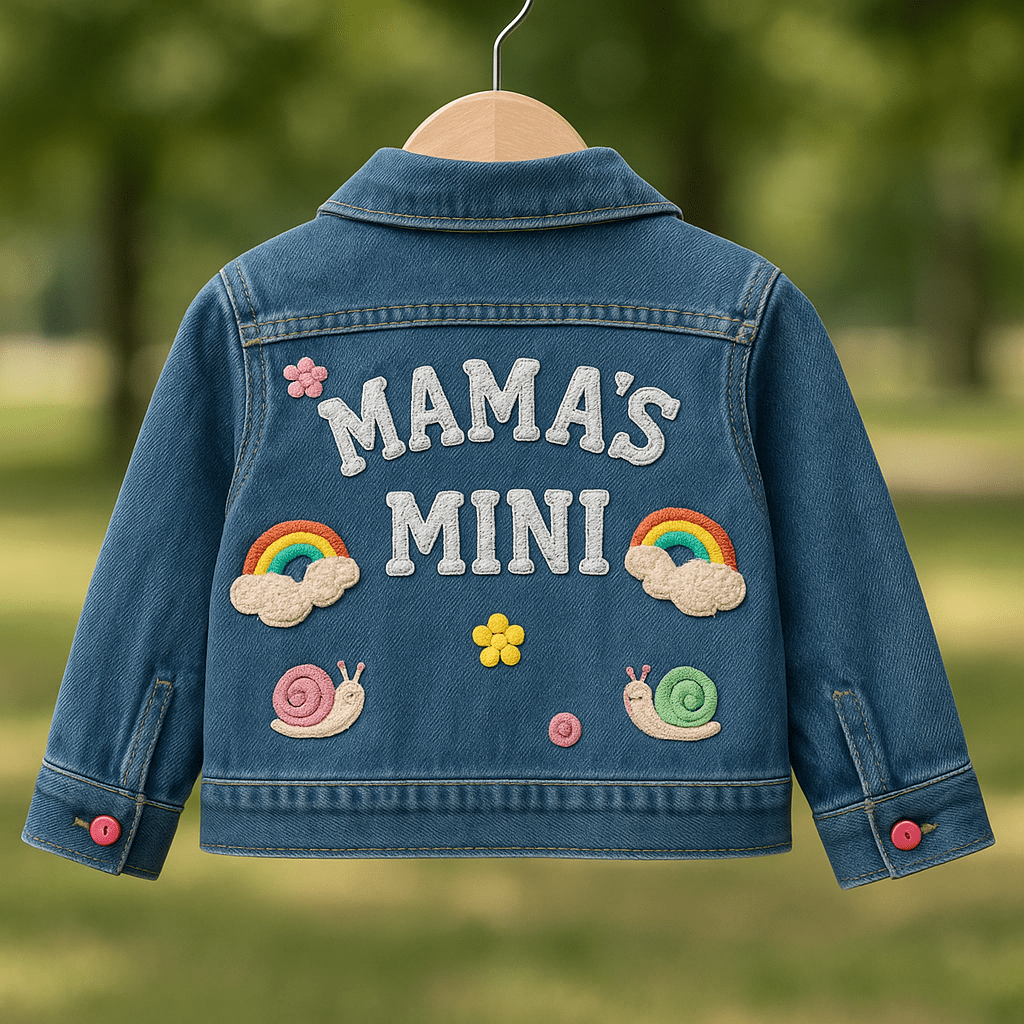 This charming denim jacket features a delightful array of embroidered and appliqué details on its back, perfect for adding a playful touch to any outfit. The centerpiece is the phrase “MAMA’S MINI” in bold, textured white lettering, creating a standout focal point. Surrounding this are vibrant, multicolored appliqués: two cheerful rainbows with fluffy cloud accents, positioned symmetrically on either side of the text. Below, whimsical snail motifs in pastel pink and green add a touch of whimsy, while a small, sunny yellow flower sits centrally beneath the text, enhancing the playful theme. The jacket’s classic denim fabric is complemented by these colorful embellishments, making it a unique and eye-catching piece. The jacket also features traditional elements such as a neat, straight hem and buttoned cuffs, with bright pink buttons adding an extra pop of color. This jacket is perfect for any little one who wants to match with their mama in style.